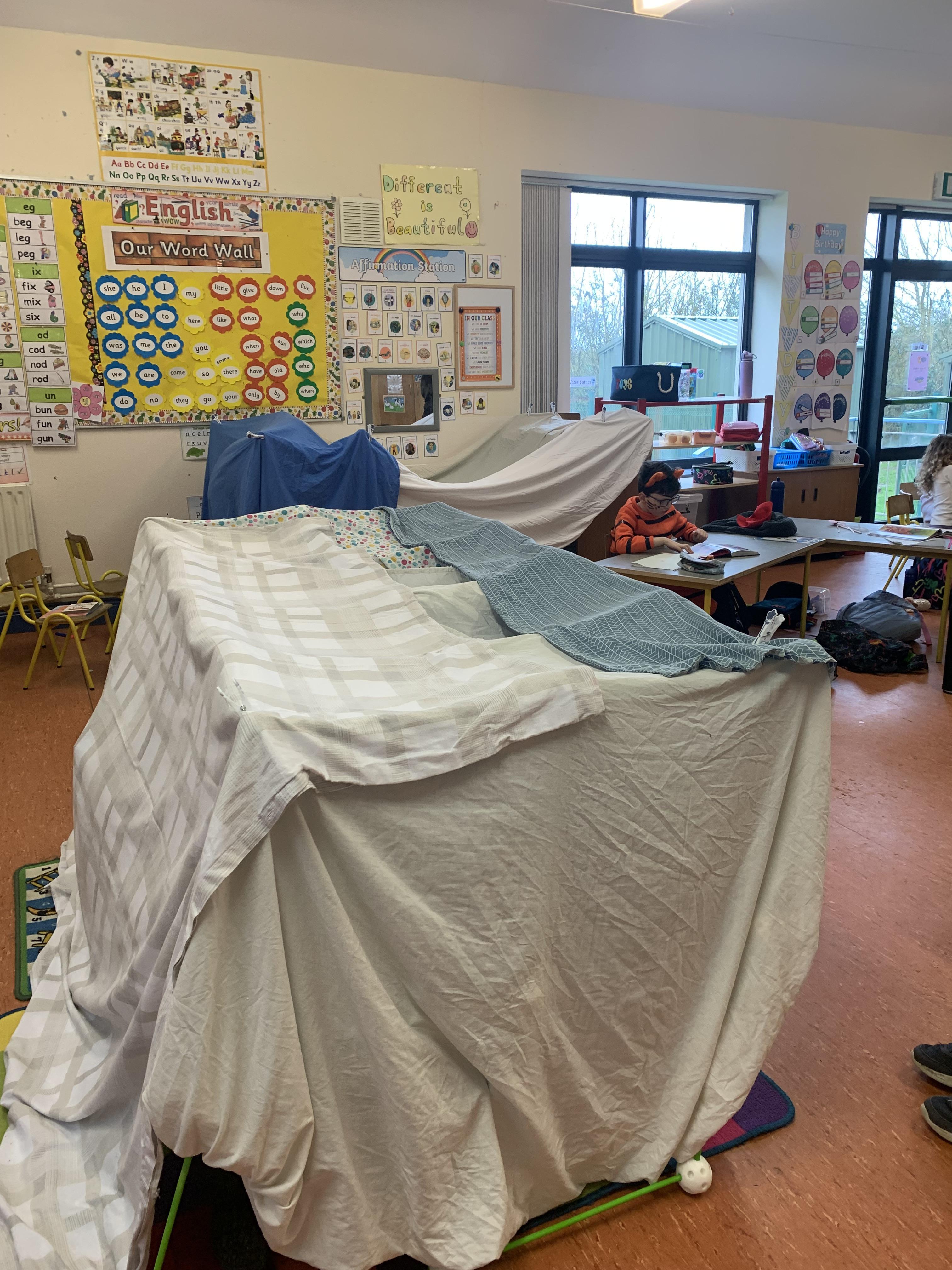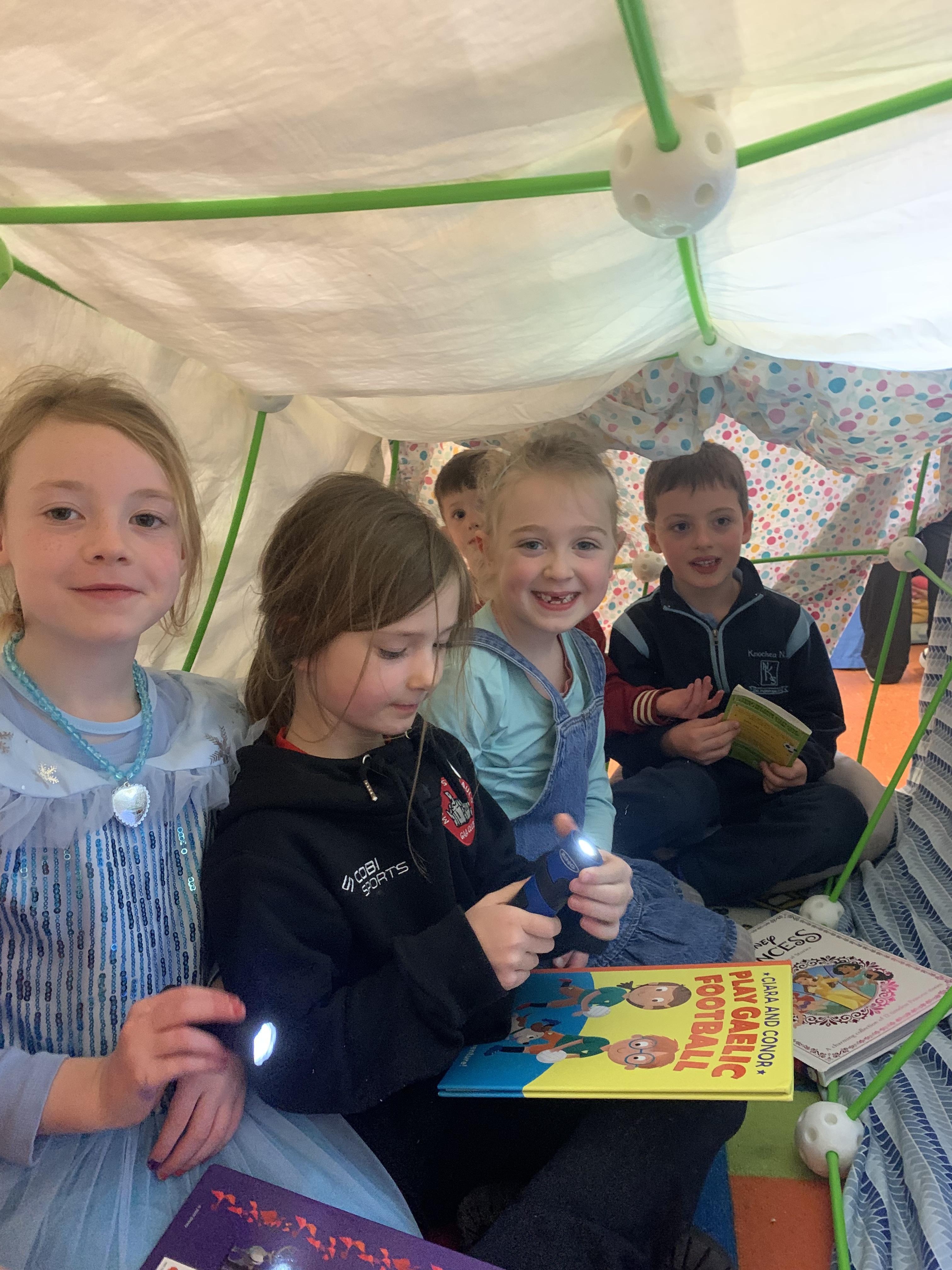 Senior Infants had a great World Book Day. They wore beautiful costumes to school, and did buddy reading with their friends in 4th Class. They also made two reading forts and spent time enjoying their books with the extra added bonus of using  some torches!! There was excellent team work shown when building the forts demonstrating  great understanding of shape and space and their creativity in STEM work.